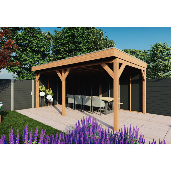Dit bouwpakket wordt geleverd inclusief alle benodigde materialen zoals, epdm, daktrimmen, hemelwaterafvoer, bevestigingsmateriaal en optioneel betonpoeren.