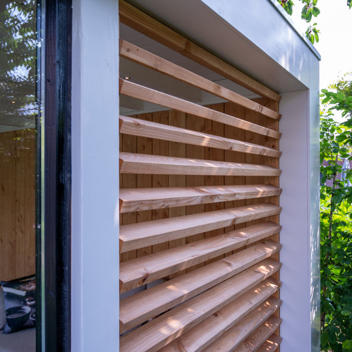 Dit louvre paneel is gemaakt van douglas hout. Douglas hout is een enorm duurzame naaldhout soort die zeer geschikt is om buiten te gebruiken. Na verloop van tijd zal het hout vergrijzen, wil je de originele kleur van het hout behouden? Behandel het dan met Remmers HK-lazuur!