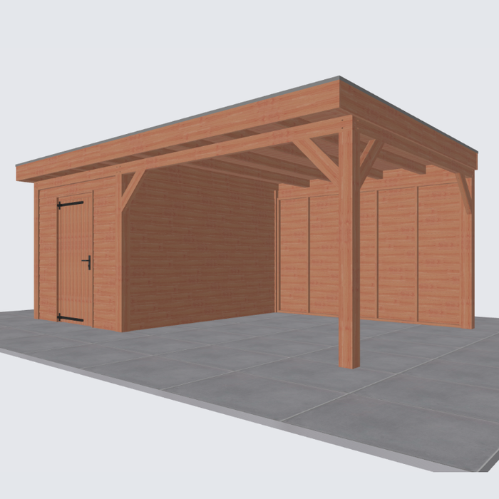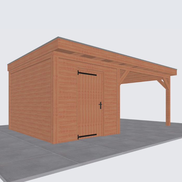 Let op: de tweede foto is een render ter inspiratie hoe de overkapping eruit komt te zien. Er kunnen kleine verschillen in de details zitten. De exacte specificaties van de overkapping vind je hieronder: