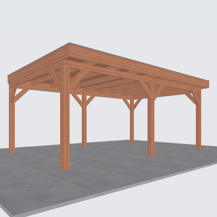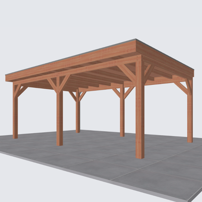 Let op: de tweede foto is een render ter inspiratie hoe de overkapping eruit komt te zien. Er kunnen kleine verschillen in de details zitten. De exacte specificaties van de overkapping vind je hieronder: