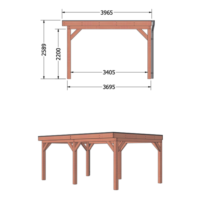 - Diepte dakmaat: 396,5cm (27cm overstek)