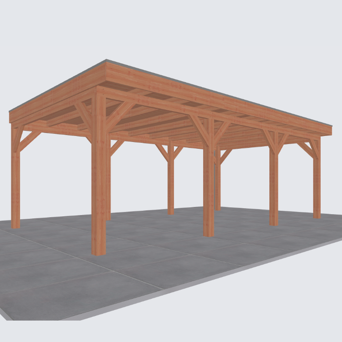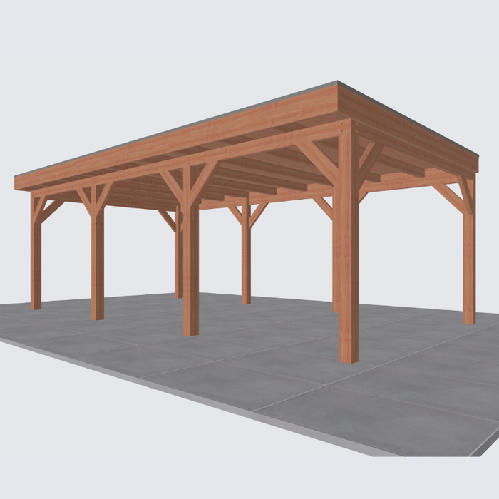 Deze overkapping wordt geleverd inclusief alle benodigde materialen zoals, douglas hout, bevestigingsmateriaal, een duidelijke opbouwhandleiding en, optioneel, epdm, daktrimmen, hemelwaterafvoer, epdm lijm, dakdoorvoer en betonpoeren.