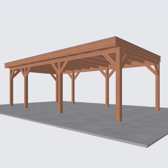 Deze overkapping wordt geleverd inclusief alle benodigde materialen zoals, douglas hout, bevestigingsmateriaal, een duidelijke opbouwhandleiding en, optioneel, epdm, daktrimmen, hemelwaterafvoer, epdm lijm, dakdoorvoer en betonpoeren.