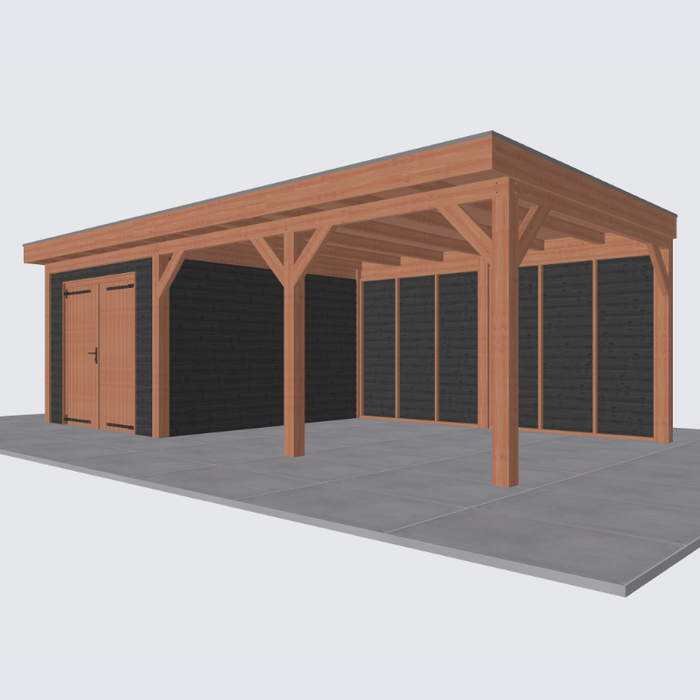 Let op: de tweede foto is een render ter inspiratie hoe de overkapping eruit komt te zien. Er kunnen kleine verschillen in de details zitten. De exacte specificaties van de overkapping vind je hieronder: