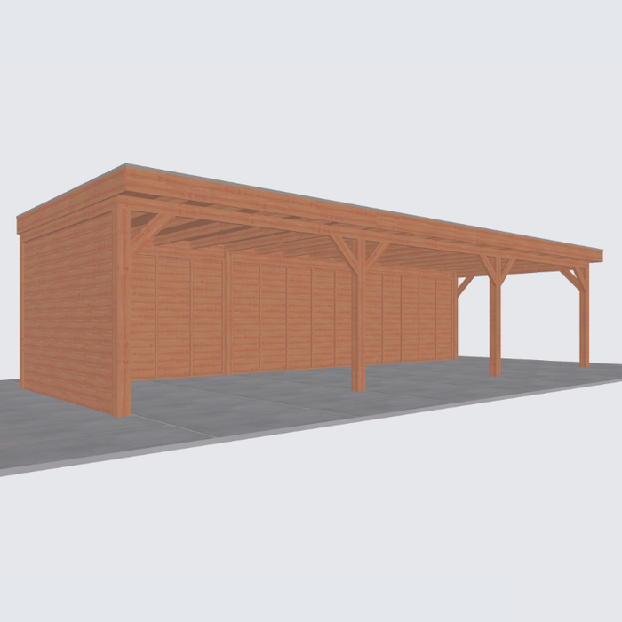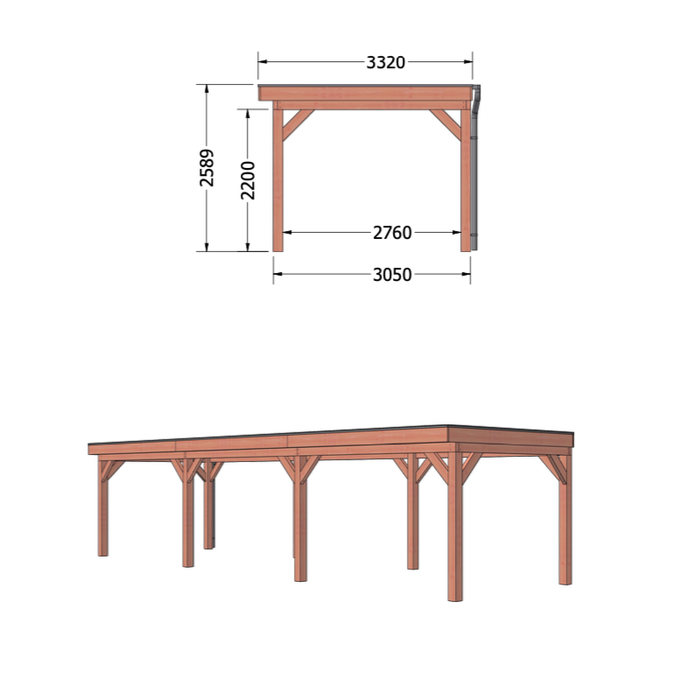 Let op: de tweede foto is een render ter inspiratie hoe de overkapping eruit komt te zien. Er kunnen kleine verschillen in de details zitten. De exacte specificaties van de overkapping vind je hieronder: