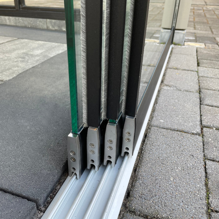 Deze 6-spoor glazen schuifwand is geschikt voor openingen met een breedte van 507 cm tot 608 cm. Deze glazen schuifwand wordt geleverd inclusief alle mogelijke accessoires als meenemers, tochtstrips deurgreep en glasopvang.