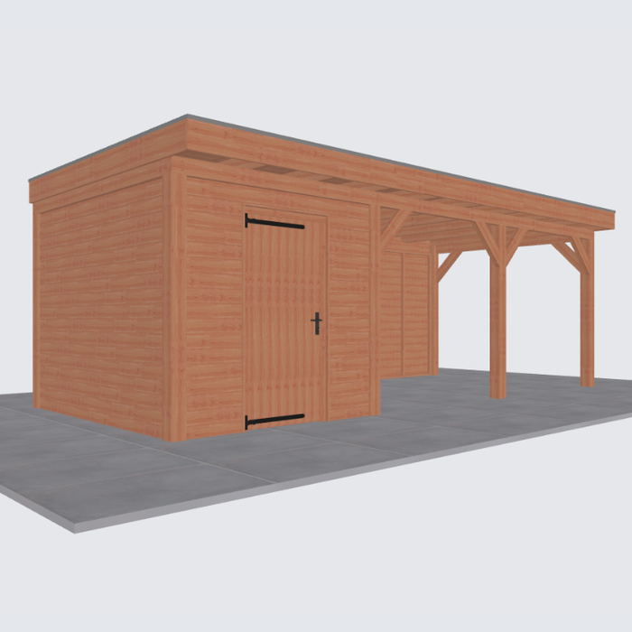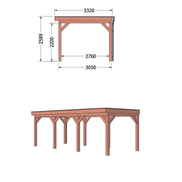 Let op: de tweede foto is een render ter inspiratie hoe de overkapping eruit komt te zien. Er kunnen kleine verschillen in de details zitten. De exacte specificaties van de overkapping vind je hieronder: