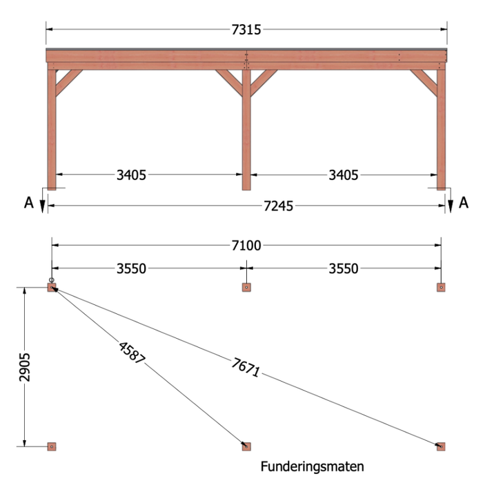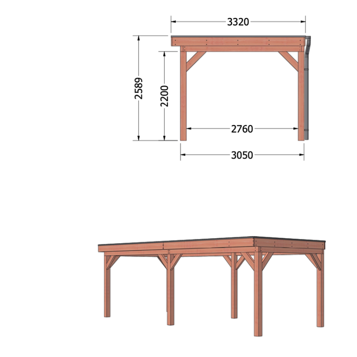 Let op: de tweede foto is een render ter inspiratie hoe de overkapping eruit komt te zien. Er kunnen kleine verschillen in de details zitten. De exacte specificaties van de overkapping vind je hieronder: